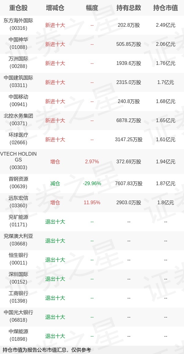 证券之星消息,4月22日易方达基金旗下成曦 杨正旺管理的易方达恒生港股通高股息低波动交易型开放式指数基金公布一季报,近1年净值增长率24.71%。与上一季度相比,该基金前十大重仓股新增东方海外国际,中国神华,万洲国际,中国建筑国际,中国移动,北控水务集团,环球医疗;其中东方海外国际持仓占比3.46%,为该基金第一大重仓股;兖矿能源,兖煤澳大利亚,恒生银行,深圳国际,工商银行,中国光大银行,中煤能源等退出前十大重仓股;详细数据如下: