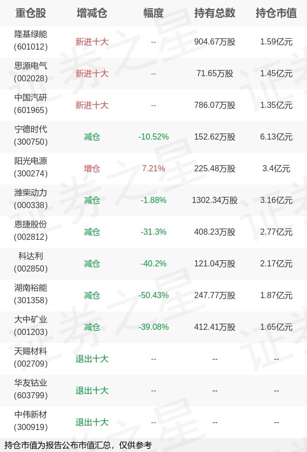 证券之星消息,4月21日农银汇理基金旗下邢军亮 左腾飞管理的农银汇理新能源主题灵活配置混合型基金公布一季报,近1年净值增长率52.57%。与上一季度相比,该基金前十大重仓股新增隆基绿能,思源电气,中国汽研;其中宁德时代持仓占比8.55%,为该基金第一大重仓股;天赐材料,华友钴业,中伟新材等退出前十大重仓股;详细数据如下: