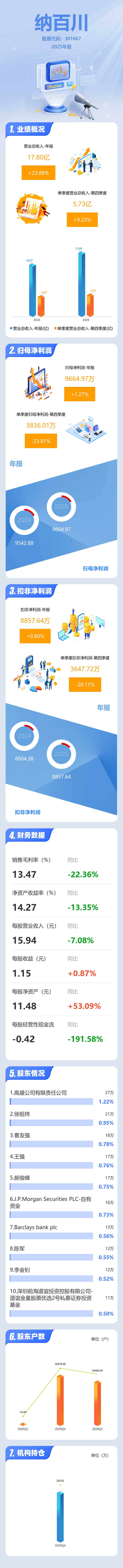证券之星消息,纳百川2025年年报显示,当年度公司主营收入17.8亿元,同比上升23.88%;归母净利润9664.97万元,同比上升1.28%;扣非净利润8857.64万元,同比上升0.6%;其中2025年第四季度,公司单季度主营收入5.73亿元,同比上升9.24%;单季度归母净利润3836.01万元,同比下降23.81%;单季度扣非净利润3647.72万元,同比下降20.12%;负债率49.65%,投资收益-476.53万元,财务费用620.0万元,毛利率13.47%。