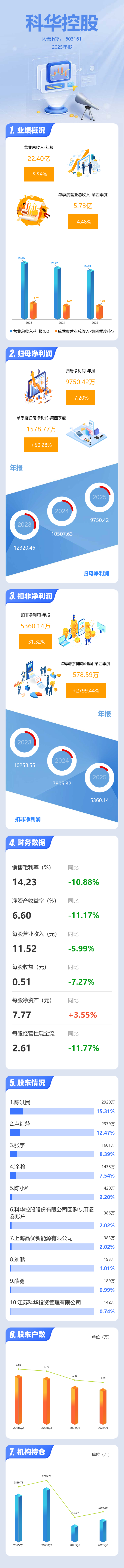 证券之星消息,科华控股2025年年报显示,当年度公司主营收入22.4亿元,同比下降5.59%;归母净利润9750.42万元,同比下降7.21%;扣非净利润5360.14万元,同比下降31.33%;其中2025年第四季度,公司单季度主营收入5.73亿元,同比下降4.49%;单季度归母净利润1578.77万元,同比上升50.28%;单季度扣非净利润578.59万元,同比上升2799.45%;负债率46.97%,投资收益29.96万元,财务费用1014.59万元,毛利率14.23%。
