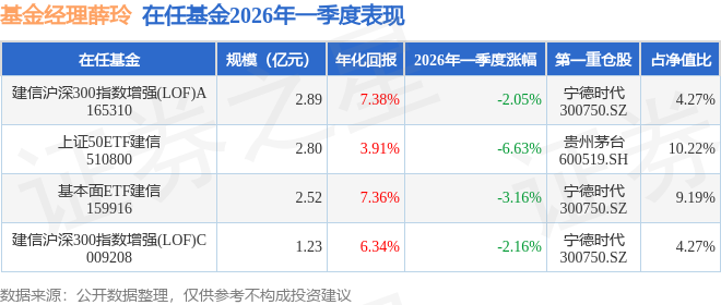 证券之星消息,截止2026年一季度末,基金经理薛玲旗下共管理4只基金,本季度表现最佳的为建信沪深300指数增强(LOF)A(165310),季度净值跌2.05%。