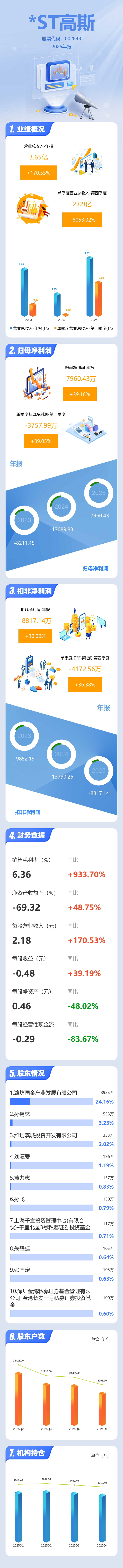 证券之星消息,*ST高斯2025年年报显示,当年度公司主营收入3.65亿元,同比上升170.55%;归母净利润-7960.43万元,同比上升39.19%;扣非净利润-8817.14万元,同比上升36.06%;其中2025年第四季度,公司单季度主营收入2.09亿元,同比上升8053.02%;单季度归母净利润-3757.99万元,同比上升39.06%;单季度扣非净利润-4172.56万元,同比上升36.39%;负债率87.78%,财务费用1098.7万元,毛利率6.36%。