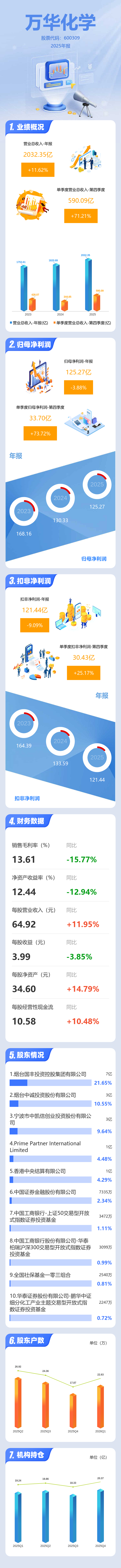 证券之星消息,万华化学2025年年报显示,当年度公司主营收入2032.35亿元,同比上升11.62%;归母净利润125.27亿元,同比下降3.88%;扣非净利润121.44亿元,同比下降9.1%;其中2025年第四季度,公司单季度主营收入590.09亿元,同比上升71.21%;单季度归母净利润33.7亿元,同比上升73.73%;单季度扣非净利润30.43亿元,同比上升25.18%;负债率62.81%,投资收益7.54亿元,财务费用20.8亿元,毛利率13.61%。