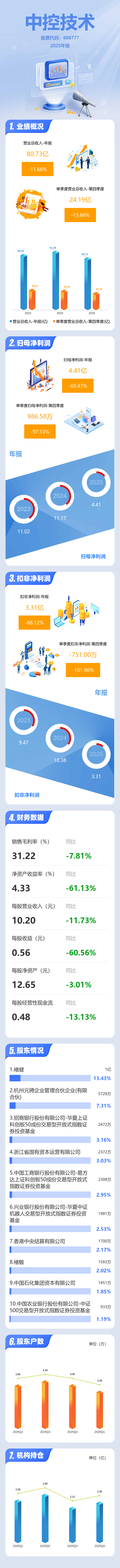 证券之星消息,中控技术2025年年报显示,当年度公司主营收入80.73亿元,同比下降11.66%;归母净利润4.41亿元,同比下降60.48%;扣非净利润3.31亿元,同比下降68.12%;其中2025年第四季度,公司单季度主营收入24.19亿元,同比下降13.67%;单季度归母净利润986.58万元,同比下降97.54%;单季度扣非净利润-751.0万元,同比下降101.96%;负债率46.29%,投资收益1.42亿元,财务费用-2840.41万元,毛利率31.22%。