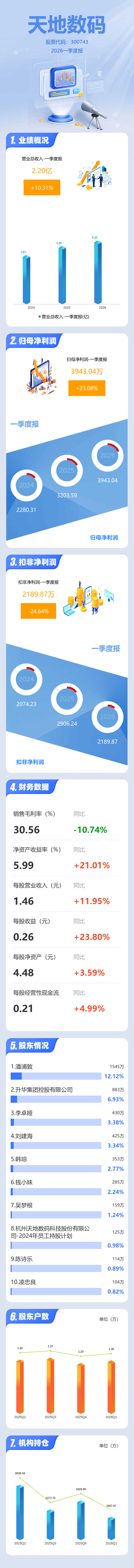 证券之星消息,天地数码2026年一季报显示,一季度公司主营收入2.2亿元,同比上升10.32%;归母净利润3943.04万元,同比上升23.08%;扣非净利润2189.87万元,同比下降24.65%;负债率34.28%,投资收益2041.65万元,财务费用67.96万元,毛利率30.56%。