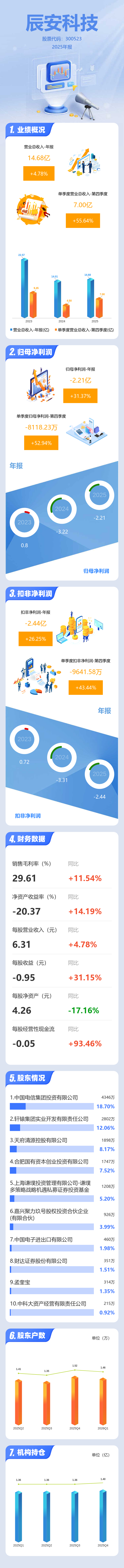 证券之星消息,辰安科技2025年年报显示,当年度公司主营收入14.68亿元,同比上升4.79%;归母净利润-2.21亿元,同比上升31.37%;扣非净利润-2.44亿元,同比上升26.25%;其中2025年第四季度,公司单季度主营收入7.0亿元,同比上升55.64%;单季度归母净利润-8118.23万元,同比上升52.95%;单季度扣非净利润-9641.58万元,同比上升43.45%;负债率70.19%,投资收益53.65万元,财务费用2134.44万元,毛利率29.61%。