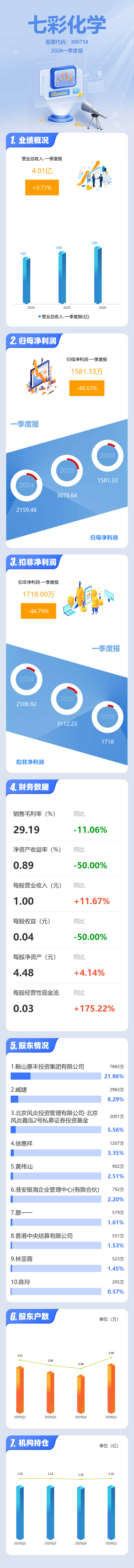 证券之星消息,七彩化学2026年一季报显示,一季度公司主营收入4.01亿元,同比上升9.77%;归母净利润1581.33万元,同比下降48.64%;扣非净利润1718.0万元,同比下降44.8%;负债率51.95%,投资收益-116.53万元,财务费用1532.89万元,毛利率29.19%。