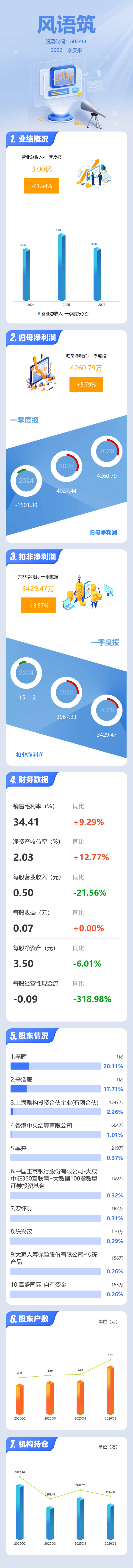 证券之星消息,风语筑2026年一季报显示,一季度公司主营收入3.0亿元,同比下降21.55%;归母净利润4260.79万元,同比上升5.79%;扣非净利润3429.47万元,同比下降13.57%;负债率51.51%,投资收益283.74万元,财务费用565.9万元,毛利率34.41%。