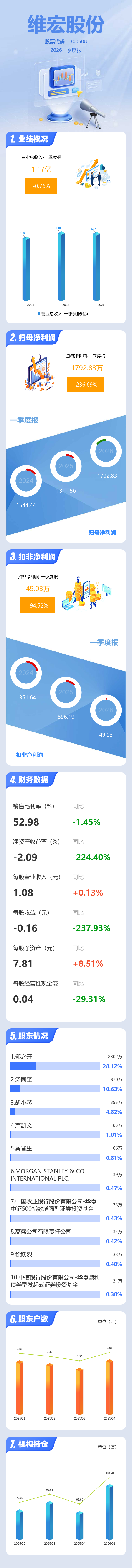 证券之星消息,维宏股份2026年一季报显示,一季度公司主营收入1.17亿元,同比下降0.76%;归母净利润-1792.83万元,同比下降236.69%;扣非净利润49.03万元,同比下降94.53%;负债率25.9%,投资收益661.98万元,财务费用88.21万元,毛利率52.98%。