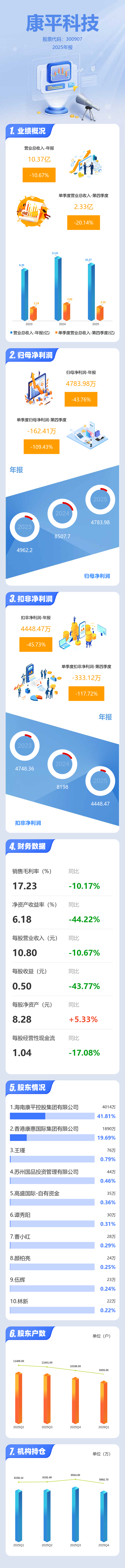 证券之星消息,康平科技2025年年报显示,当年度公司主营收入10.37亿元,同比下降10.68%;归母净利润4783.98万元,同比下降43.77%;扣非净利润4448.47万元,同比下降45.74%;其中2025年第四季度,公司单季度主营收入2.33亿元,同比下降20.14%;单季度归母净利润-162.41万元,同比下降109.43%;单季度扣非净利润-333.12万元,同比下降117.73%;负债率58.56%,投资收益218.54万元,财务费用476.91万元,毛利率17.23%。
