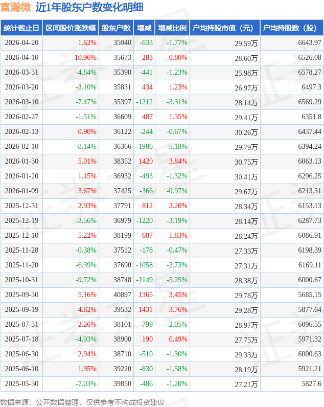 证券之星消息,近日富瀚微披露,截至2026年4月20日公司股东户数为3.5万户,较4月10日减少633.0户,减幅为1.77%。户均持股数量由上期的6526.0股增加至6644.0股,户均持股市值为29.59万元。