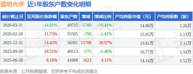 从股价来看,2026年2月28日至2026年3月31日,道明光学区间跌幅为14.81%,在此期间股东户数减少5780.0户,减幅为10.41%。