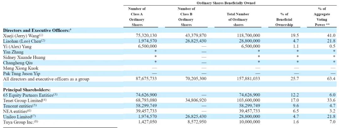 淡马锡旗下65 Equity Partners持股为12.2%,有6%的投票权;腾讯持股9.6%,有4.7%投票权;NEA entities持股6.5%,有3.2%投票权。