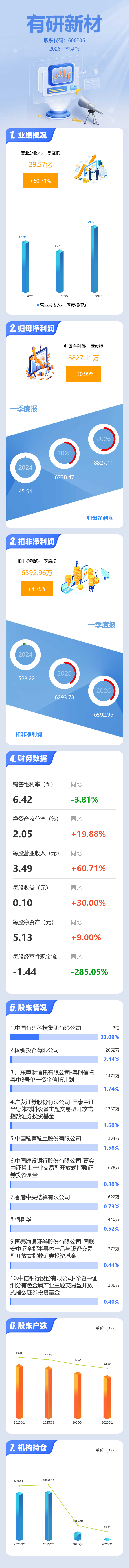 证券之星消息,有研新材2026年一季报显示,一季度公司主营收入29.57亿元,同比上升60.72%;归母净利润8827.11万元,同比上升31.0%;扣非净利润6592.96万元,同比上升4.75%;负债率35.22%,投资收益756.71万元,财务费用843.36万元,毛利率6.42%。