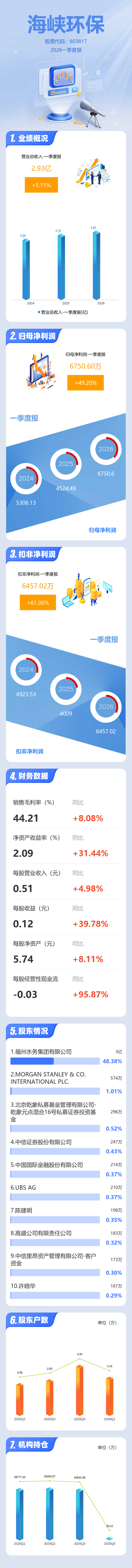 证券之星消息,海峡环保2026年一季报显示,一季度公司主营收入2.93亿元,同比上升5.11%;归母净利润6750.6万元,同比上升49.2%;扣非净利润6457.02万元,同比上升61.06%;负债率52.08%,投资收益306.6万元,财务费用1822.7万元,毛利率44.21%。