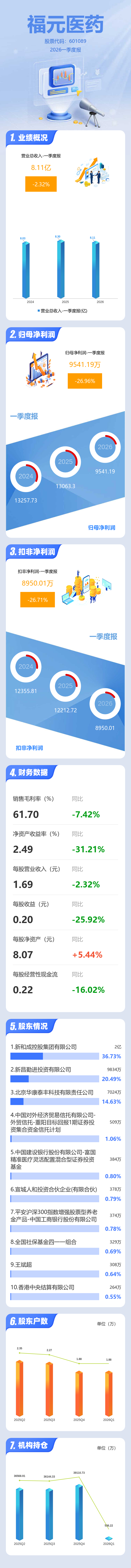 证券之星消息,福元医药2026年一季报显示,一季度公司主营收入8.11亿元,同比下降2.32%;归母净利润9541.19万元,同比下降26.96%;扣非净利润8950.01万元,同比下降26.72%;负债率21.19%,投资收益517.19万元,财务费用6.92万元,毛利率61.7%。
