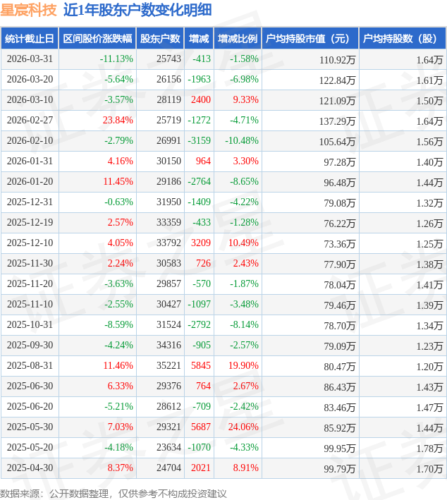 从股价来看,2026年3月20日至2026年3月31日,星宸科技区间跌幅为11.13%,在此期间股东户数减少413.0户,减幅为1.58%。