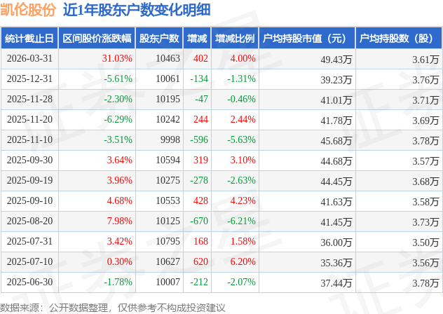 从股价来看,2025年12月31日至2026年3月31日,凯伦股份区间涨幅为31.03%,在此期间股东户数增加402.0户,增幅为4.0%。