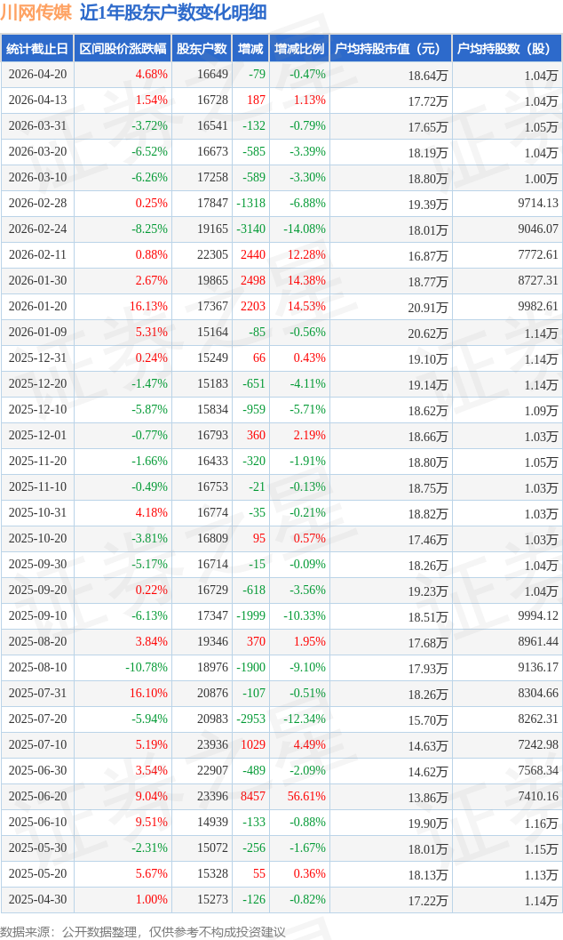 从股价来看,2026年4月13日至2026年4月20日,川网传媒区间涨幅为4.68%,在此期间股东户数减少79.0户,减幅为0.47%。