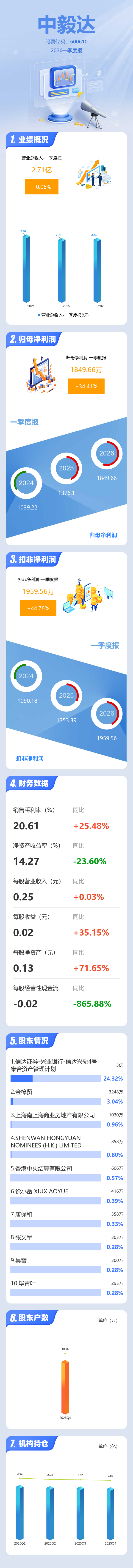 证券之星消息,中毅达2026年一季报显示,一季度公司主营收入2.71亿元,同比上升0.07%;归母净利润1849.66万元,同比上升34.41%;扣非净利润1959.56万元,同比上升44.79%;负债率86.73%,财务费用1060.78万元,毛利率20.61%。
