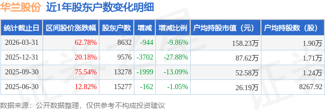 从股价来看,2025年12月31日至2026年3月31日,华兰股份区间涨幅为62.78%,在此期间股东户数减少944.0户,减幅为9.86%。