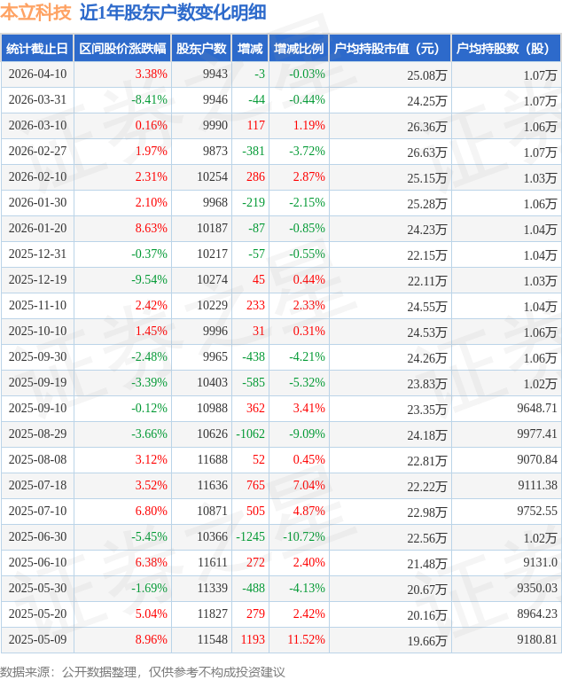 证券之星消息,近日本立科技披露,截至2026年4月10日公司股东户数为9943.0户,较3月31日减少3.0户,减幅为0.03%。户均持股数量由上期的1.07万股增加至1.07万股,户均持股市值为25.08万元。
