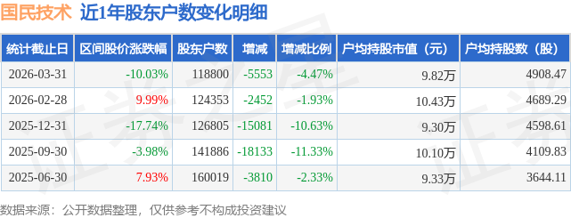 从股价来看,2026年2月28日至2026年3月31日,国民技术区间跌幅为10.03%,在此期间股东户数减少5553.0户,减幅为4.47%。