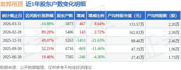 证券之星消息,近日友邦吊顶披露,截至2026年3月31日公司股东户数为5873.0户,较2月28日增加467.0户,增幅为8.64%。户均持股数量由上期的2.39万股减少至2.2万股,户均持股市值为133.57万元。