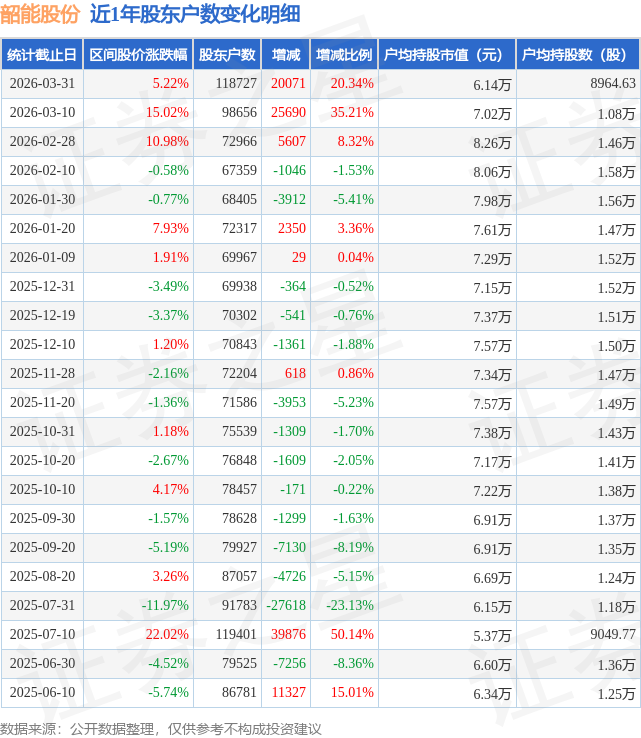从股价来看,2026年3月10日至2026年3月31日,韶能股份区间涨幅为5.22%,在此期间股东户数增加2.01万户,增幅为20.34%。