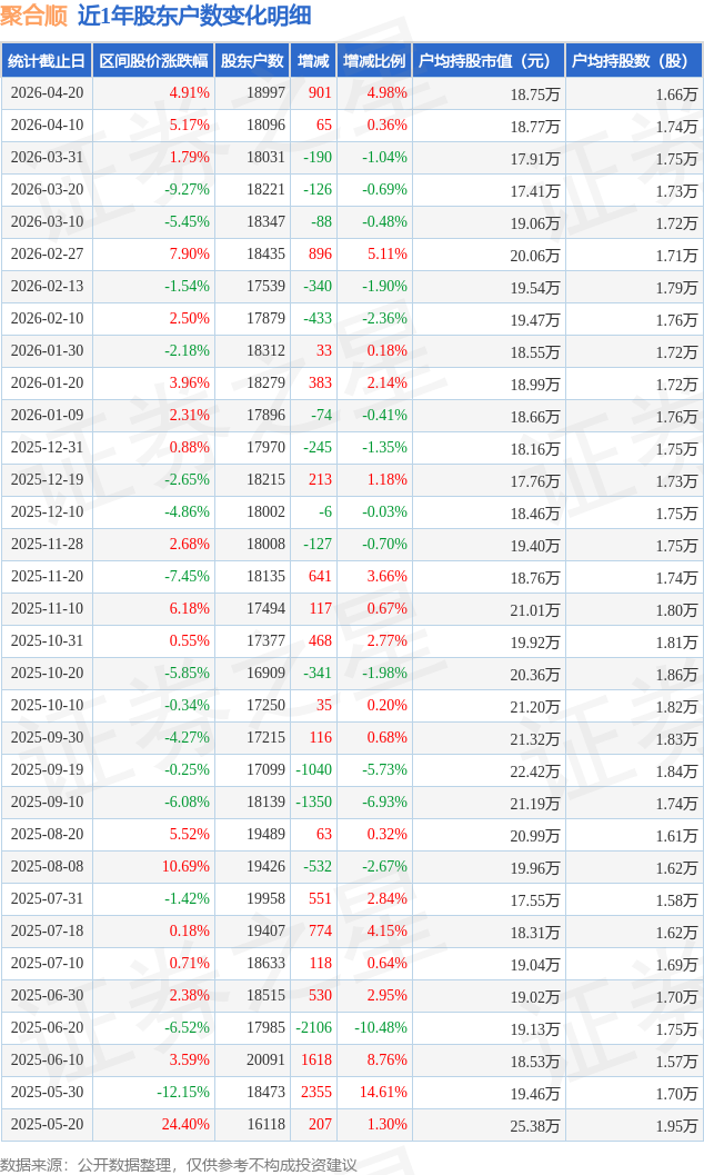 从股价来看,2026年4月10日至2026年4月20日,聚合顺区间涨幅为4.91%,在此期间股东户数增加901.0户,增幅为4.98%。