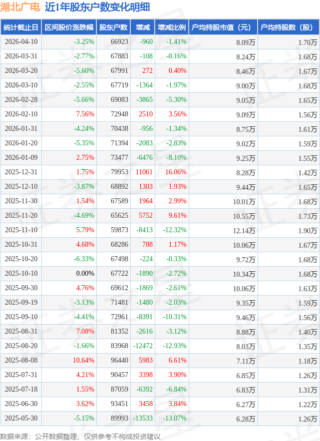 从股价来看,2026年3月31日至2026年4月10日,湖北广电区间跌幅为3.25%,在此期间股东户数减少960.0户,减幅为1.41%。
