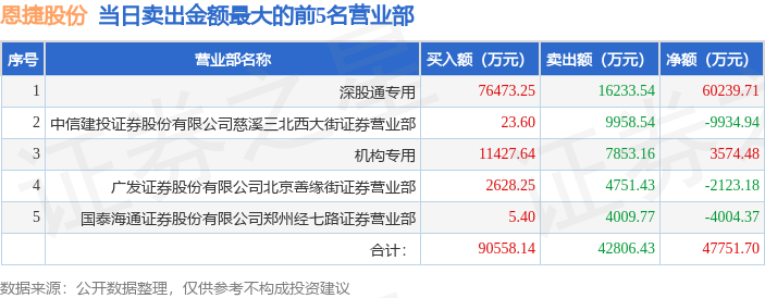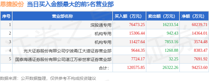 证券之星消息,沪深交易所2026年4月24日公布的交易公开信息显示,恩捷股份(002812)因日涨幅偏离值达到7%的前5只证券登上龙虎榜。此次是近5个交易日内第1次上榜。