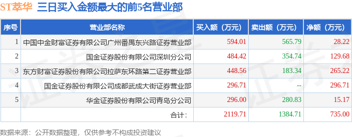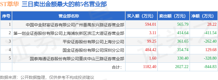 证券之星消息,沪深交易所2026年4月24日公布的交易公开信息显示,ST萃华(002731)因连续三个交易日内,跌幅偏离值累计达到12%的ST证券、*ST证券和未完成股改证券登上龙虎榜。此次是近5个交易日内第2次上榜。