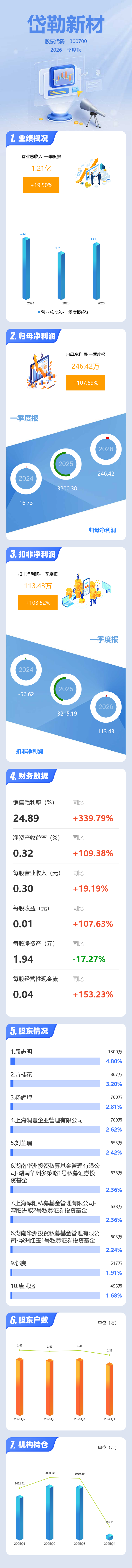 证券之星消息,岱勒新材2026年一季报显示,一季度公司主营收入1.21亿元,同比上升19.5%;归母净利润246.42万元,同比上升107.7%;扣非净利润113.43万元,同比上升103.53%;负债率55.47%,投资收益-88.53万元,财务费用398.87万元,毛利率24.89%。