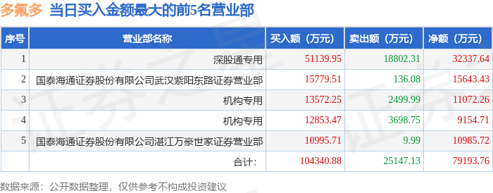 证券小知识:龙虎榜是交易所披露的竞价交易公开信息,现身龙虎榜的个股都是当日最为活跃的个股,是投资者日常重点关注的数据。交易所公布当日买入金额和卖出金额前五名的席位,其中一些席位代表特殊意义,如机构专用席位是指基金专用席位、券商自营专用席位、社保专用席位、券商理财专用席位、保险机构专用席位、保险机构租用席位、QFII专用席位等机构投资者买卖证券的专用通道和席位。深股通专用、沪股通专用为北向资金的交易席位。
