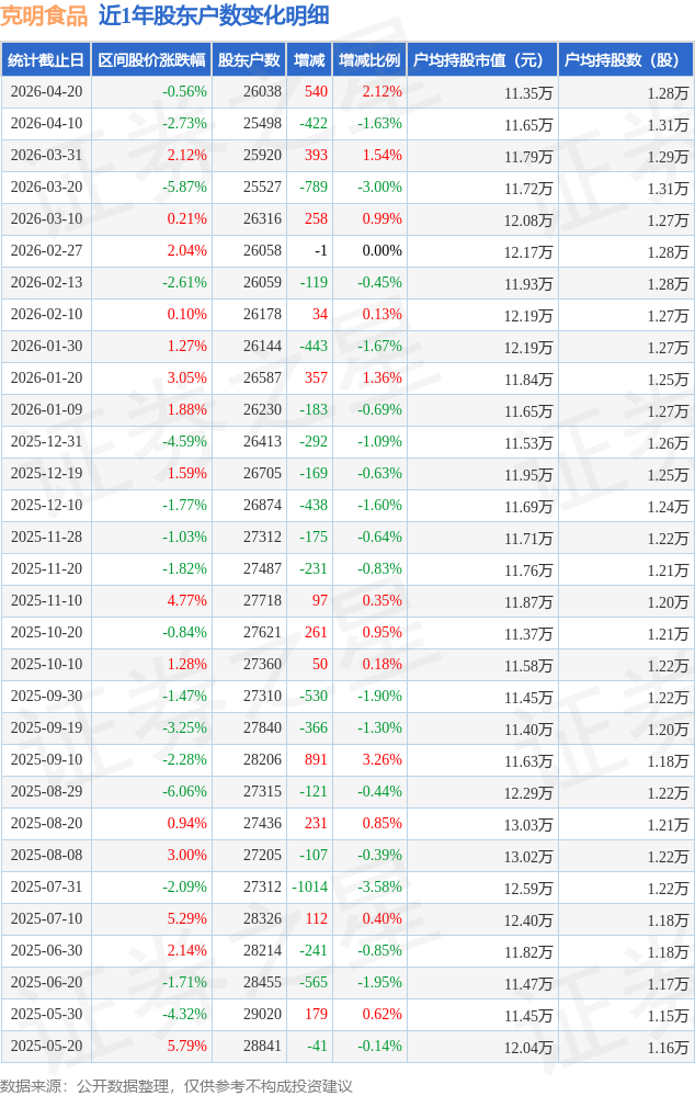 从股价来看,2026年4月10日至2026年4月20日,克明食品区间跌幅为0.56%,在此期间股东户数增加540.0户,增幅为2.12%。