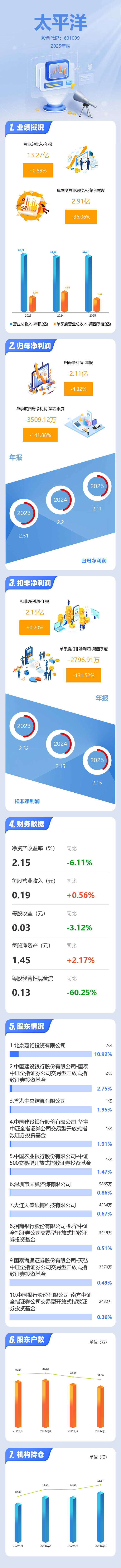 证券之星消息,太平洋2025年年报显示,当年度公司主营收入13.27亿元,同比上升0.6%;归母净利润2.11亿元,同比下降4.32%;扣非净利润2.15亿元,同比上升0.2%;其中2025年第四季度,公司单季度主营收入2.91亿元,同比下降36.06%;单季度归母净利润-3509.12万元,同比下降141.88%;单季度扣非净利润-2796.91万元,同比下降131.53%;负债率50.25%,投资收益2.97亿元。