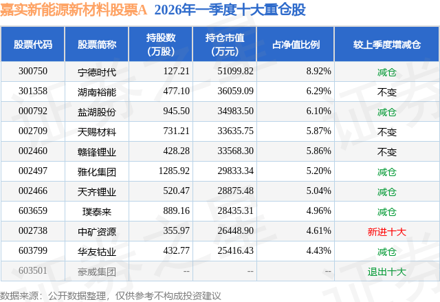 嘉实新能源新材料股票A的前十大重仓股如下: