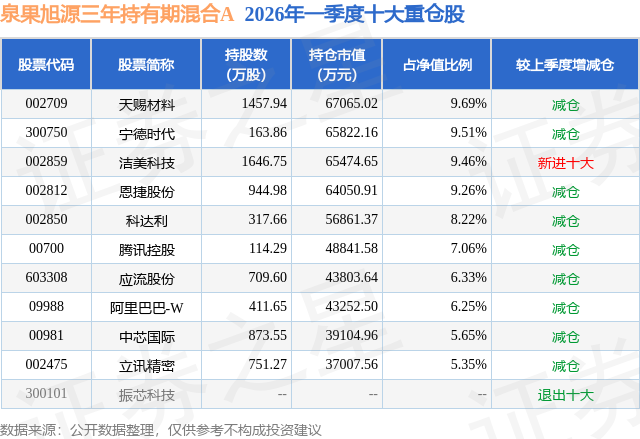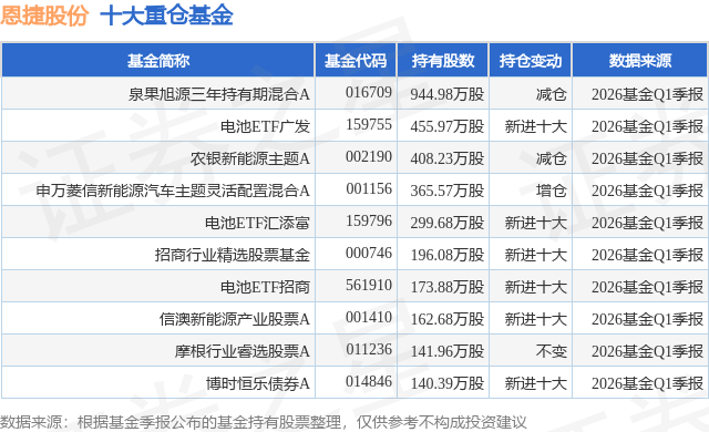 根据2026基金Q1季报公募基金重仓股数据,重仓该股的公募基金共119家,其中持有数量最多的公募基金为泉果基金的泉果旭源三年持有期混合A。泉果旭源三年持有期混合A目前规模为58.86亿元,最新净值1.2467(4月23日),较上一交易日下跌1.57%,近一年上涨68.36%。该公募基金现任基金经理为赵诣。
