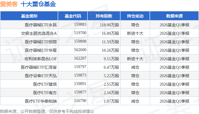 持有爱美客最多的基金为医疗器械ETF永赢,目前规模为55.46亿元,最新净值0.4849(4月23日),较上一交易日下跌0.66%,近一年上涨4.8%。该基金现任基金经理为储可凡。
