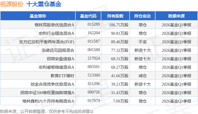 持有视源股份最多的基金为格林高股息优选混合A,目前规模为1.17亿元,最新净值1.7444(4月23日),较上一交易日下跌0.11%,近一年上涨22.24%。该基金现任基金经理为刘赞。