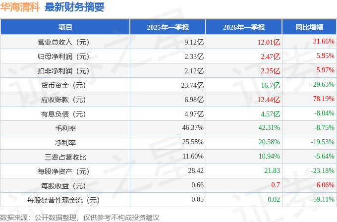 据证券之星公开数据整理,近期华海清科(688120)发布2026年一季报。截至本报告期末,公司营业总收入12.01亿元,同比上升31.66%,归母净利润2.47亿元,同比上升5.95%。按单季度数据看,第一季度营业总收入12.01亿元,同比上升31.66%,第一季度归母净利润2.47亿元,同比上升5.95%。本报告期华海清科应收账款上升,应收账款同比增幅达78.19%。