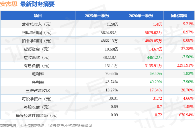 据证券之星公开数据整理,近期安杰思(688581)发布2026年一季报。截至本报告期末,公司营业总收入1.4亿元,同比上升9.21%,归母净利润5679.62万元,同比上升0.97%。按单季度数据看,第一季度营业总收入1.4亿元,同比上升9.21%,第一季度归母净利润5679.62万元,同比上升0.97%。本报告期安杰思三费占比上升明显,财务费用、销售费用和管理费用总和占总营收同比增幅达30.7%。