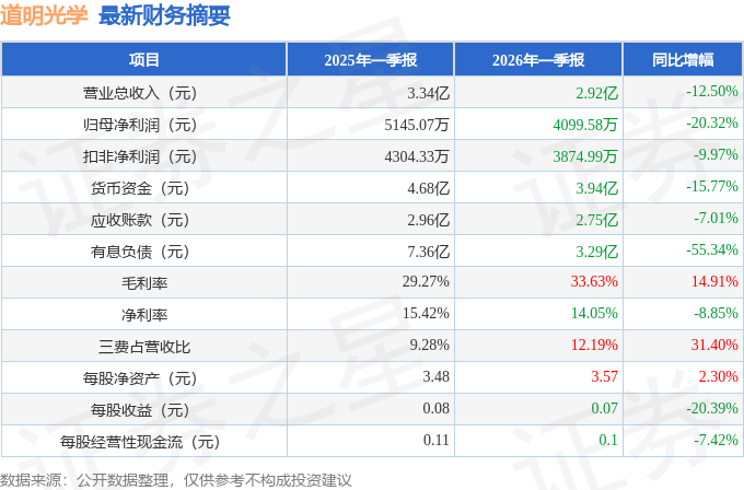 据证券之星公开数据整理,近期道明光学(002632)发布2026年一季报。截至本报告期末,公司营业总收入2.92亿元,同比下降12.5%,归母净利润4099.58万元,同比下降20.32%。按单季度数据看,第一季度营业总收入2.92亿元,同比下降12.5%,第一季度归母净利润4099.58万元,同比下降20.32%。本报告期道明光学三费占比上升明显,财务费用、销售费用和管理费用总和占总营收同比增幅达31.4%。