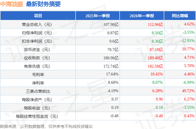 据证券之星公开数据整理,近期中海油服(601808)发布2026年一季报。截至本报告期末,公司营业总收入112.96亿元,同比上升4.62%,归母净利润8.56亿元,同比下降3.55%。按单季度数据看,第一季度营业总收入112.96亿元,同比上升4.62%,第一季度归母净利润8.56亿元,同比下降3.55%。本报告期中海油服公司应收账款体量较大,当期应收账款占最新年报归母净利润比达493.21%。