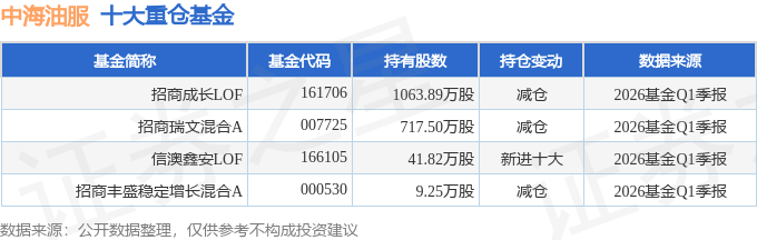持有中海油服最多的基金为招商成长LOF,目前规模为19.35亿元,最新净值4.2317(4月23日),较上一交易日上涨0.41%,近一年上涨22.05%。该基金现任基金经理为吴潇。