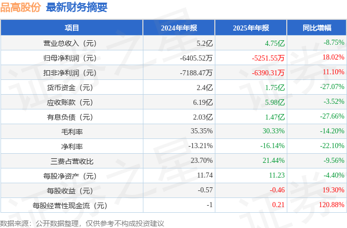 据证券之星公开数据整理,近期品高股份(688227)发布2025年年报。截至本报告期末,公司营业总收入4.75亿元,同比下降8.75%,归母净利润-5251.55万元,同比上升18.02%。按单季度数据看,第四季度营业总收入2.52亿元,同比下降21.93%,第四季度归母净利润-1967.75万元,同比下降13.16%。本报告期品高股份公司应收账款体量较大,当期应收账款占最新年报营业总收入比达125.94%。