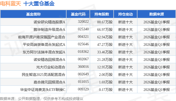 持有电科蓝天最多的基金为诺安研究精选股票A,目前规模为6.68亿元,最新净值2.968(4月23日),较上一交易日下跌1.2%,近一年上涨71.07%。该基金现任基金经理为唐晨。