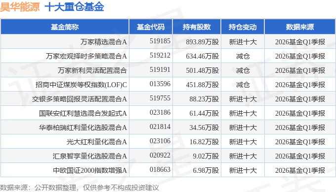 持有昊华能源最多的基金为万家精选混合A,目前规模为8.66亿元,最新净值2.0427(4月23日),较上一交易日上涨1.8%,近一年上涨38.02%。该基金现任基金经理为黄海。