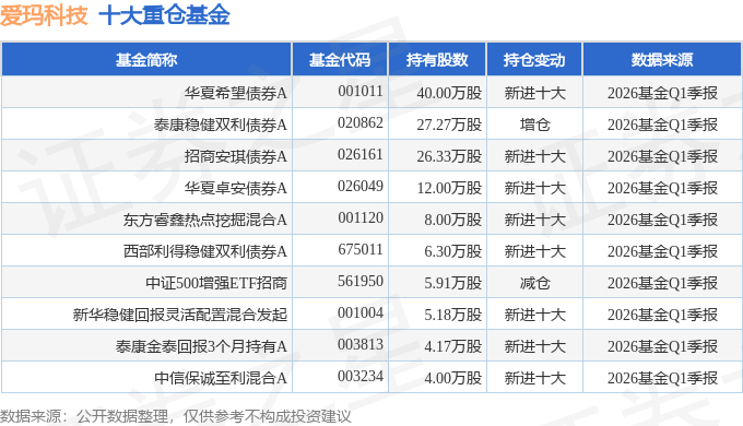 持有爱玛科技最多的基金为华夏希望债券A,目前规模为35.15亿元,最新净值1.2565(4月23日),较上一交易日下跌0.08%,近一年上涨4.88%。该基金现任基金经理为吴彬 吴凡。